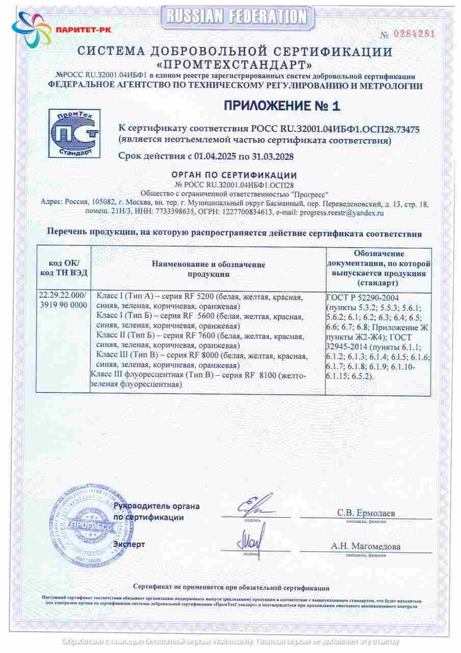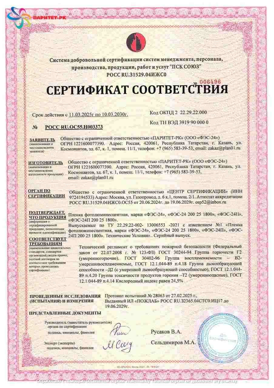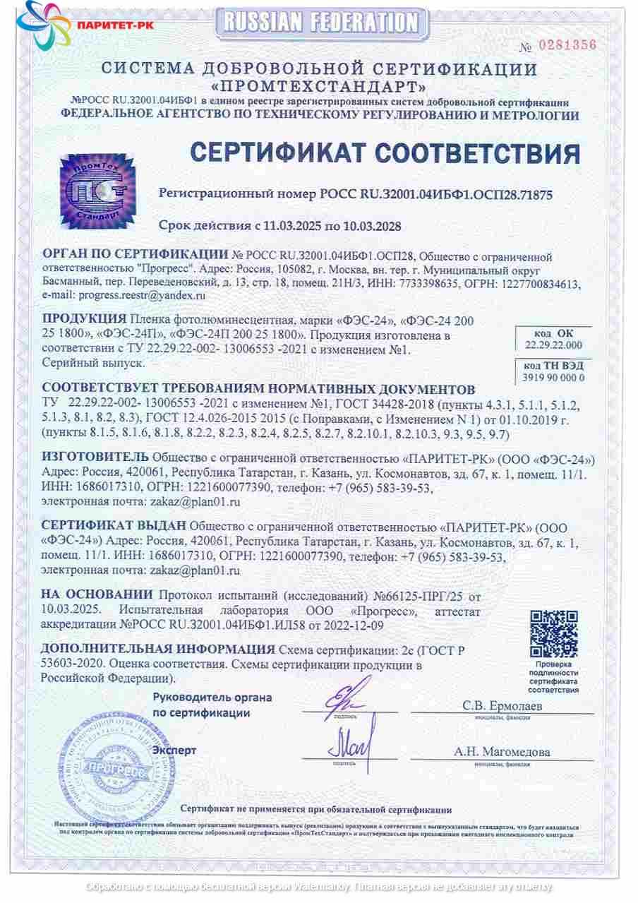 ООО "Паритет-РК" с 2012 года уверенно занимает лидирующие позиции на российском рынке фотолюминесцентной пленки. Наша продукция соответствует требованиям ГОСТ 12.4.026-2015 с изменением №1 от 01.10.2019 г. и ГОСТ 34428-2018, что подтверждено сертификатами качества и безопасности.