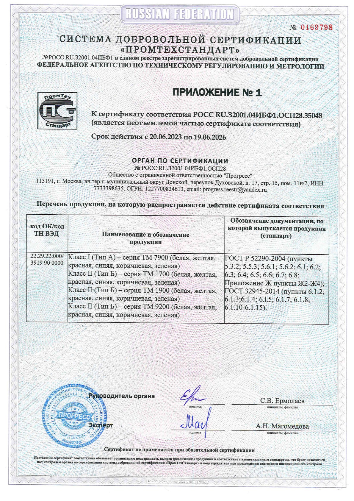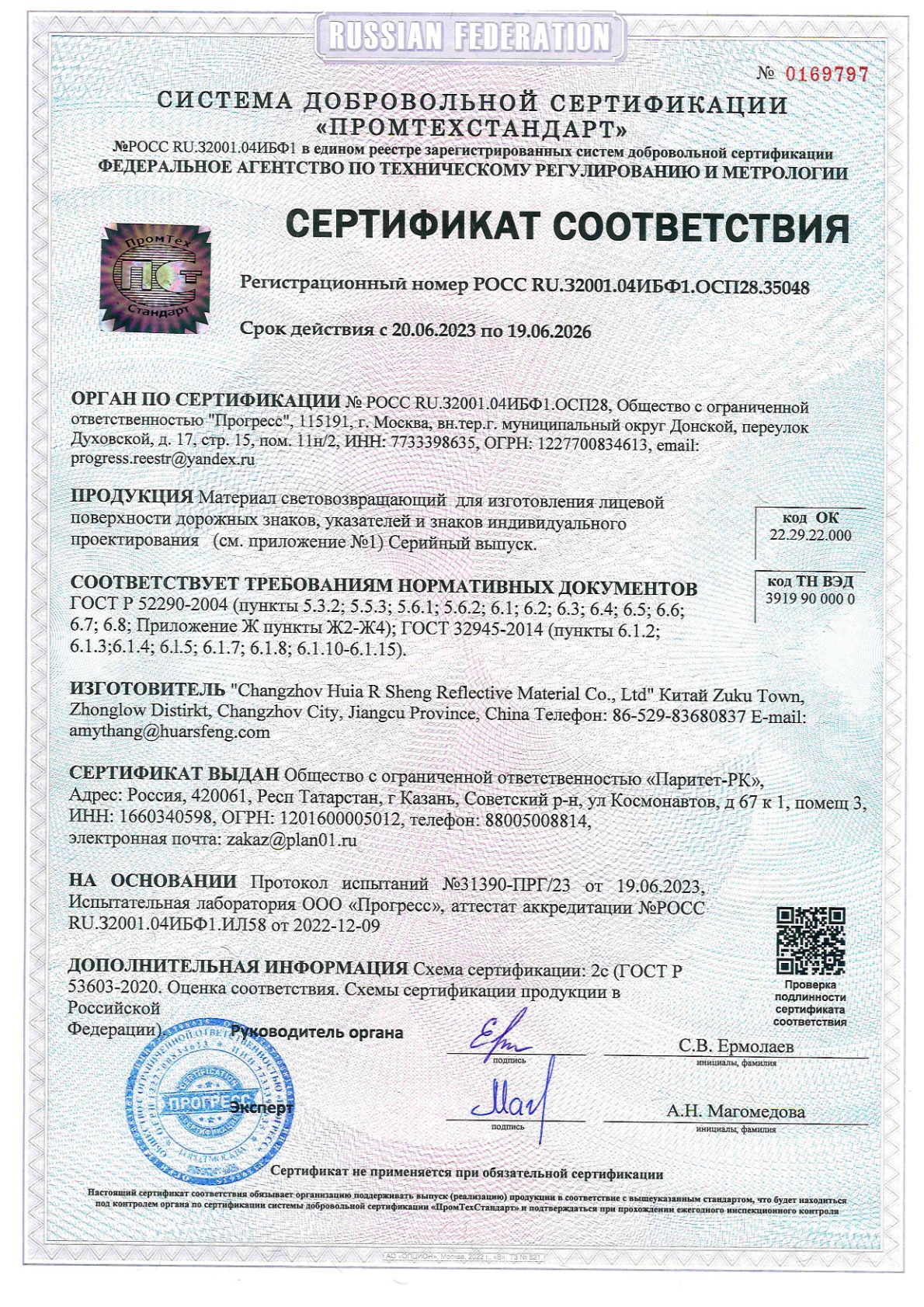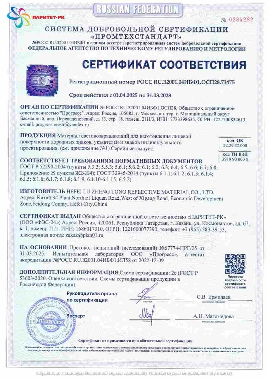 ООО "Паритет-РК" с 2012 года уверенно занимает лидирующие позиции на российском рынке фотолюминесцентной пленки. Наша продукция соответствует требованиям ГОСТ 12.4.026-2015 с изменением №1 от 01.10.2019 г. и ГОСТ 34428-2018, что подтверждено сертификатами качества и безопасности.